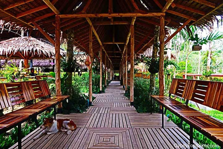The entrance is a beautifully and artfully designed, sustainable, wooden walkway, crafted from renewable resources such as bamboo, and palm frond covered thatch roofs.  Benches are purposely crafted onto the sides of the walkway to provide a restful and peaceful stop.  It is here you can enjoy the gardens beyond, listen to the sounds of the jungle and soak in the atmosphere of the sanctuary
